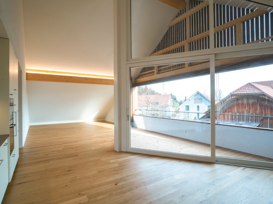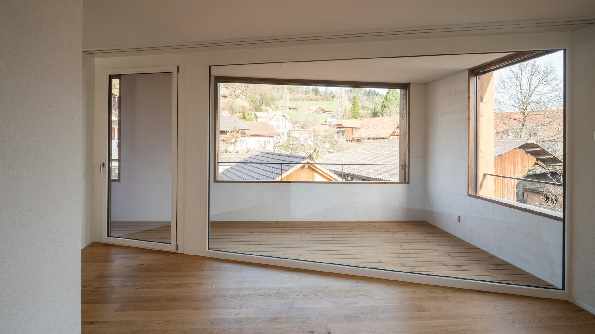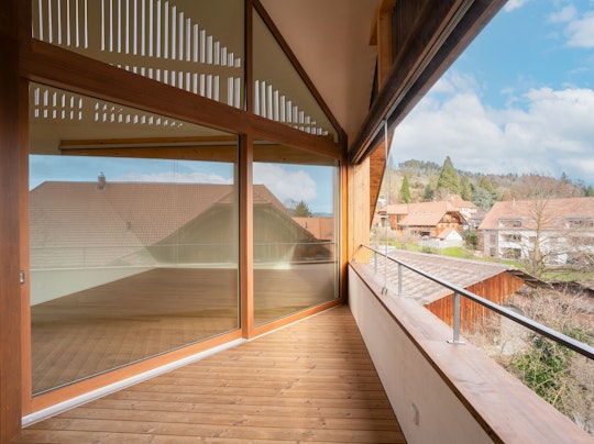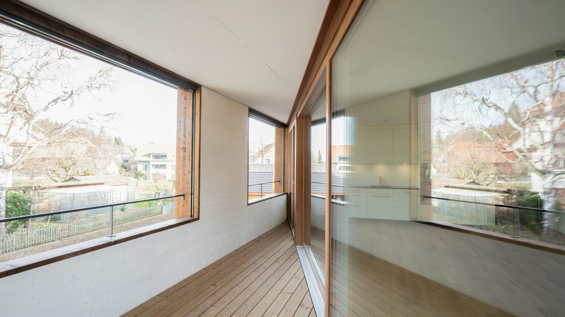 Wettersichere Loggias in den Hausecken und dem Firstdreieck bieten private Aussenräume, die mit grossen Schiebtüren mit den Innenräumen zu grossen Flächen verbunden werden können.