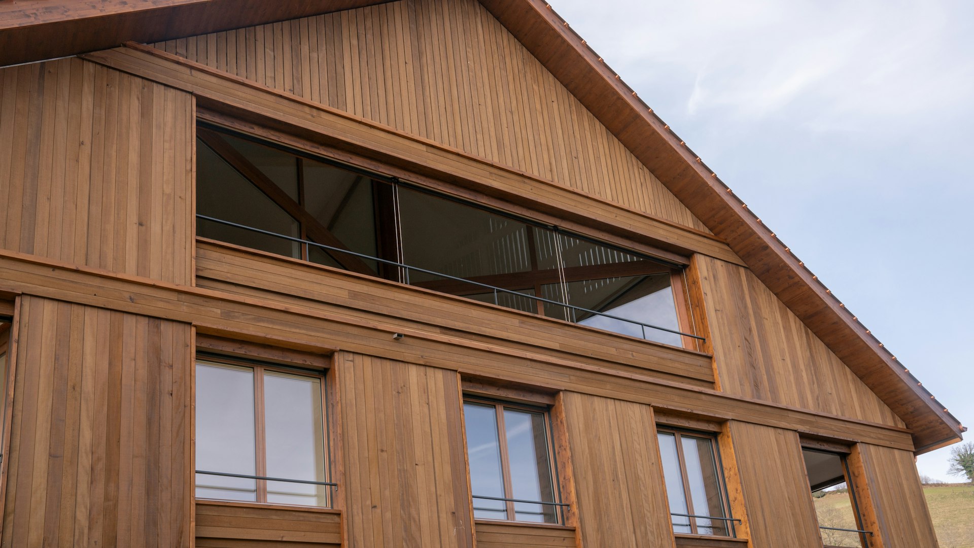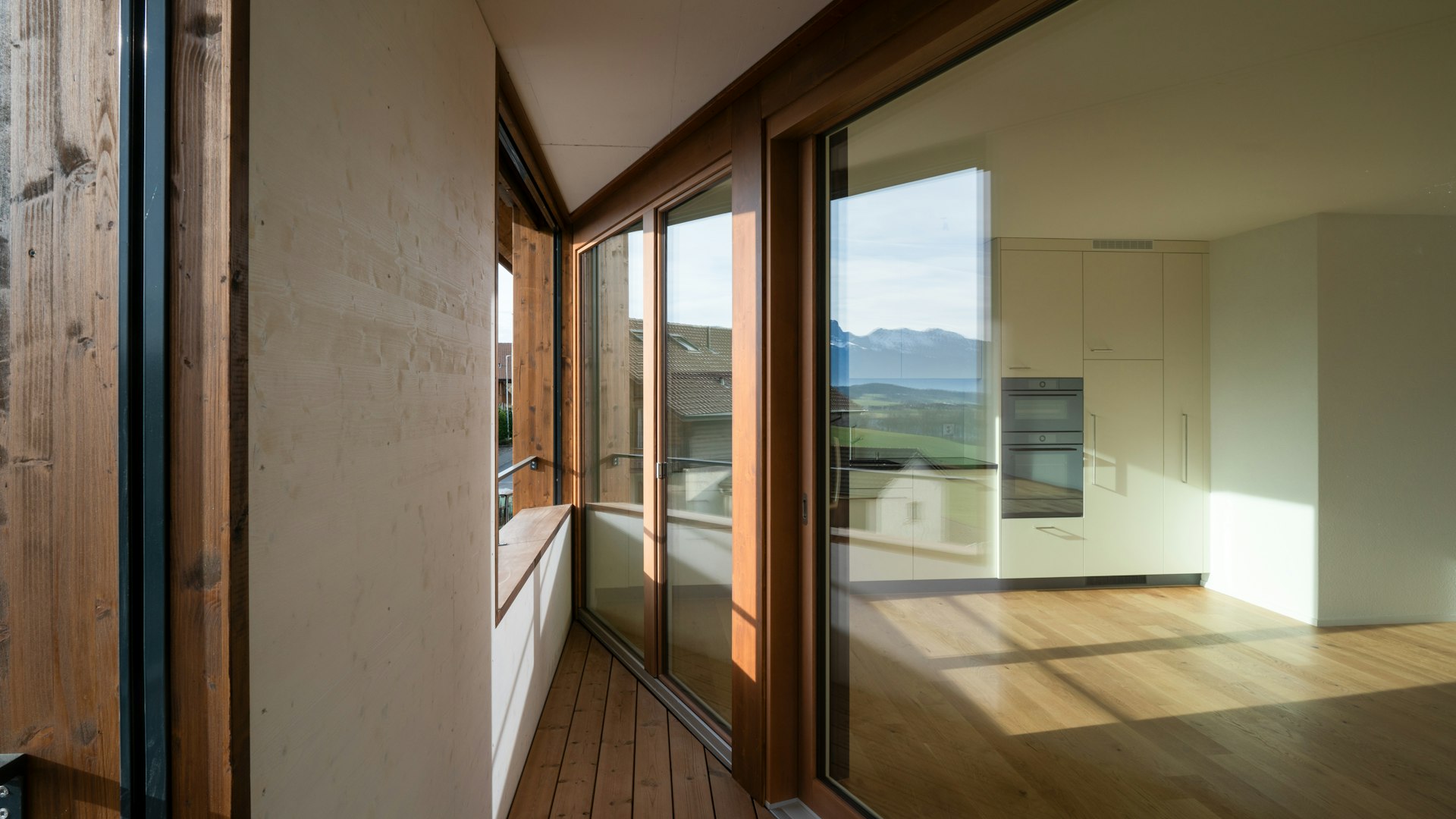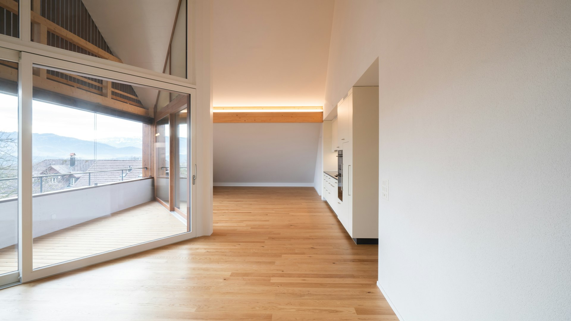 Wettersichere Loggias in den Hausecken und dem Firstdreieck bieten private Aussenräume, die mit grossen Schiebtüren mit den Innenräumen zu grossen Flächen verbunden werden können.