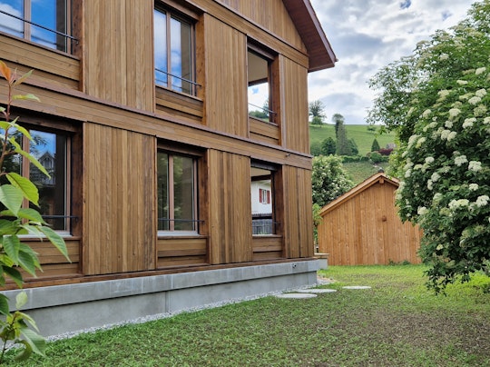 Eine Hostett als gemeinschaftlicher Aussenraum mit Obstbäumen, Bänken Spielflächen und einem Schuppen lädt alle Bewohnerinnen und Bewohner zum Verweilen ein.